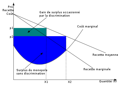 L'entreprise monopoleuse accroît son profit tant que la vente d'une unité supplémentaire rapporte davantage qu'elle ne coûte, c'est-à-dire tant que la recette marginale est supérieure au coût marginal. Logiquement, l'équilibre se réalise par conséquent quand la courbe de recette marginale intercepte celle de coût marginal. Le nouvel équilibre correspond à celui d'un prix (Pm>Pc) plus élevé qu'en situation de concurrence, ainsi qu'à une quantité produite inférieure (Xm Le profit est alors égal à la recette moyenne, à laquelle se soustrait le coût moyen, multipliée par la quantité produite. Il est représenté par la surface verte sur le graphique. Le profit ( La recette totale est quant à elle égale à la recette moyenne (par unité vendue, c'est-à-dire le prix de vente unitaire) multipliée par le nombre d'unités vendues. On a donc D'après les règles de base, la fonction Π atteint un extremum quand sa dérivée est nulle. D'autre part, on suppose que RM, la recette moyenne (c'est-à-dire le prix) est une fonction décroissante. Cette hypothèse découle du fait que l'entreprise qui souhaite accroître la quantité (Q) d'unité vendu doit accepter une baisse du prix de vente. La relation mathématique entre la variation marginale et la moyenne implique que si RM est décroissante, alors Rm l'est aussi et Donc Or en situation de concurrence l'équilibre est donné par la relation : Et comme Conclusion : La quantité d'équilibre en situation de monopole est inférieure à celle de concurrence, alors que le prix d'équilibre du monopole est supérieur à celui d'un marché concurrentiel. De nombreuses études empiriques ont étudié le niveau de rendement des investissements des entreprises selon le degré de concentration des marchés, c'est-à-dire la faiblesse de la concurrence). Ses études montrent que la profitabilité des entreprises et leur concentration ne seraient que faiblement corrélées. Selon George Stigler, moins de 25 pourcent de la variation des profits ne sont attribuables à la concentration[8]. La théorie des marchés contestables repose sur un argument unique : si un monopole fait des profits, il doit exister des entreprises voulant entrer sur le marché pour prendre une partie de ces profits en vendant légèrement plus et moins cher que le monopole en place. Dans sa version extrême, cette théorie affirme par conséquent que la menace que fait peser cette entrée potentielle oblige le monopole à se comporter comme s'il était effectivement en concurrence idéale, ainsi qu'à vendre au coût moyen. Le monopole ne se distingue alors plus de la situation de concurrence. Cette théorie a originellement été proposée par W. J. Baumol, J. Panzar et B. Willig dans Contestable Markets and the Theory of Industry Structure, Harcourt Brace, New York, 1982. En pratique, entrer sur un marché est coûteux (coûts fixes). Un entrant potentiel ne va par conséquent entrer que s'il espère faire des profits supérieurs à ces coûts, ce qui ne sera pas envisageable si le monopole en place le contraint à une guerre des prix qui conduit les deux entreprises à vendre au coût moyen. La pression concurrentielle potentielle dépend par conséquent de l'ampleur des coûts fixes et de la crédibilité de la menace de guerre des prix (une fois le nouveau entré sur le marché, le monopole peut avoir intérêt à partager la rente avec lui plutôt que de faire la guerre). Empiriquement, cette théorie explique un phénomène récurrent observé lors de l'ouverture à la concurrence d'un marché où agissait un monopole : on constate que le monopole baisse ses prix avant qu'aucune autre entreprise ne soit entrée sur le marché. Il signale ainsi sa volonté et sa capacité à engager avec un entrant une guerre des prix plutôt que de partager la rente. Dans les cas présentés jusqu'ici, le monopole vend son produit à un prix unique. Soit il fixe un prix élevé mais rationne la clientèle en empêchant les acheteurs disposés à payer qu'un petit prix d'acheter le produit, soit il fixe un prix bas. Dans ce derniers cas le monopole n'exploite pas la disponibilité à payer des plus riches qui seraient prêt à payer plus pour obtenir ce bien. Le monopole peut par conséquent accroître son profit en pratiquant un prix différent pour différentes catégories de consommateurs, selon l'impact qu'a le prix sur le volume de leur consommation. Il s'agit simplement de faire payer plus chers les acheteurs prêt à payer davantage, et d'accorder une réduction seulement aux groupes pour lesquels un prix inférieur provoque une hausse importante des ventes. Un exemple typique de discrimination est , par exemple, les réductions permises par la détention d'une carte étudiant. Accorder à un étudiant une réduction permet d'accroître les ventes sans pour tout autant diminuer le prix payé par les autres consommateurs. Ainsi le graphique de droite représente la situation d'une entreprise qui fait payer deux prix différents, à deux catégories différentes de consommateurs. Elle vend une quantité X1 de produits à un prix P1, puis vend (X2-X1) produits à un prix inférieur P2. Ce faisant, elle accroît son profit au détriment du groupe d'acheteurs discriminé négativement. On ne peut pour tout autant conclure que la situation profite aux groupes d'acheteurs bénéficiant d'un prix réduit, car même réduit, ce prix reste au-dessus du prix pratiqué pour la totalité des acheteurs en situation de concurrence. Il est aussi envisageable de pratiquer une discrimination sur les unités vendues. En effet, chaque consommateur tend à trouver une satisfaction plus grande dans les premières unités qu'il consomme d'un bien, l'utilité marginale de la majorité des biens étant décroissante. Il n'est par conséquent pas prêt à payer le même prix pour la première unité que pour la suivante. Le monopoleur a par conséquent intérêt à différencier, pour chaq