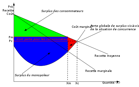 Sur un marché concurrentiel, la concurrence entre les entreprises a pour conséquence d'égaliser le prix de vente au coût marginal de production, c'est-à-dire le coût de la dernière unité produite. Le monopole n'étant pas soumis à cette pression concurrentielle, il est en mesure de vendre ses produits au-dessus du coût marginal, obtenant ainsi des profits plus élevés. À la différence d'une situation d'oligopole ou de concurrence, le cas du monopole est l'unique où il soit indifférent que le monopole fixe son prix ou son volume de ventes sur le marché.