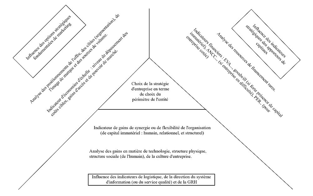 - L'organisation (par l'intermédiaire de l'urbanisation de son système d'information (management du dispositif d'information), des ressources humaines et de la logistique) apporte des indicateurs utiles concernant les synergies attendues de l'évolution du périmètre de l'entité. Ces synergies concernent, selon certains auteurs, la technologie, la structure sociale, la structure physique, et la culture d'entreprise[11].
